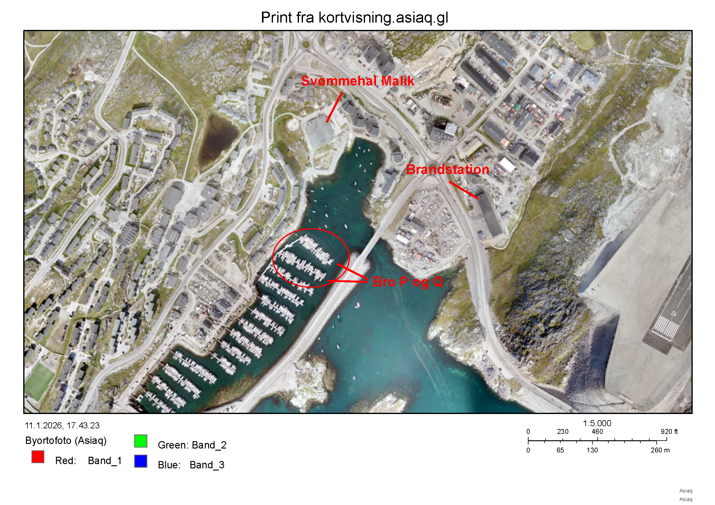 Forvaltning for Anlæg og Miljø har modtaget en ansøgning om arealtildeling til omlægning af bro Q og etablering af 2 stk. nye brofag med betonfundamenter til forankring for landgang, samt ponton på nordlige del af Iggai, KPT 2C3-1 detailområde A, Nuussuaq.
