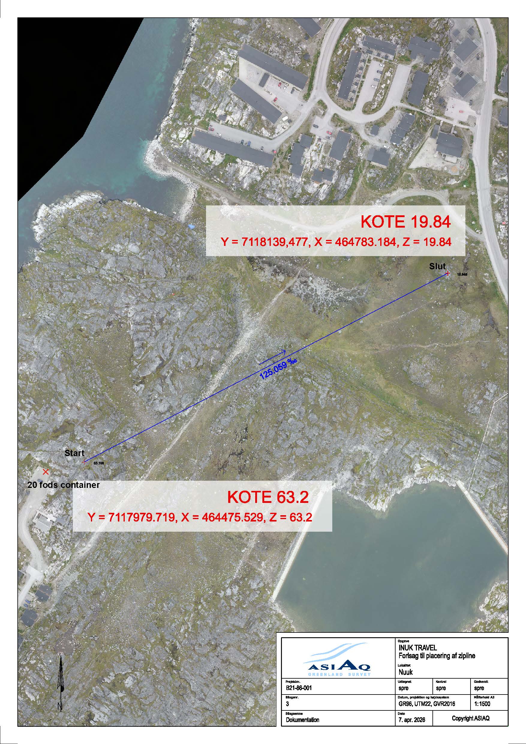 Ansøgningen omfatter etablering af start- og slutplatform samt opsætning af en 20 fods container til drift og udstyr. Startstedet etableres som en terrasseplatform på 5 x 5 meter med tilhørende terrasse på 10 x 10 meter, som skal anvendes til vente- og udsigtsområde. Slutplatformen etableres som en terrasse på 5 x 5 meter.